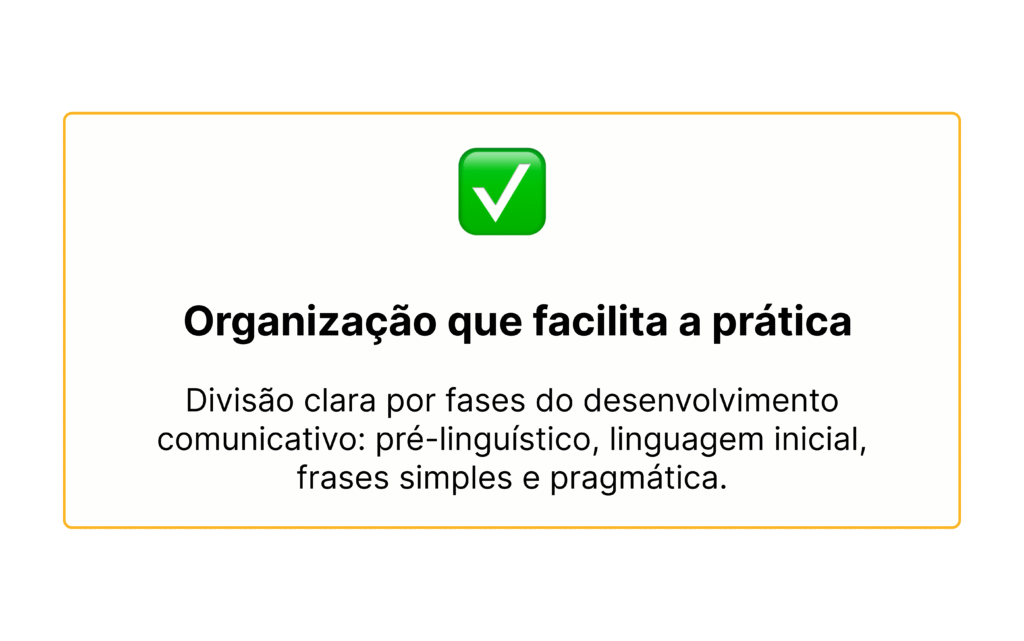 O manual é 100% prático. Você terá 32 protocolos clínicos estruturados passo a passo, além de cartões, quadros de comunicação, fichas e checklists para aplicar diretamente nas sessões, sem precisar criar nada do zero.